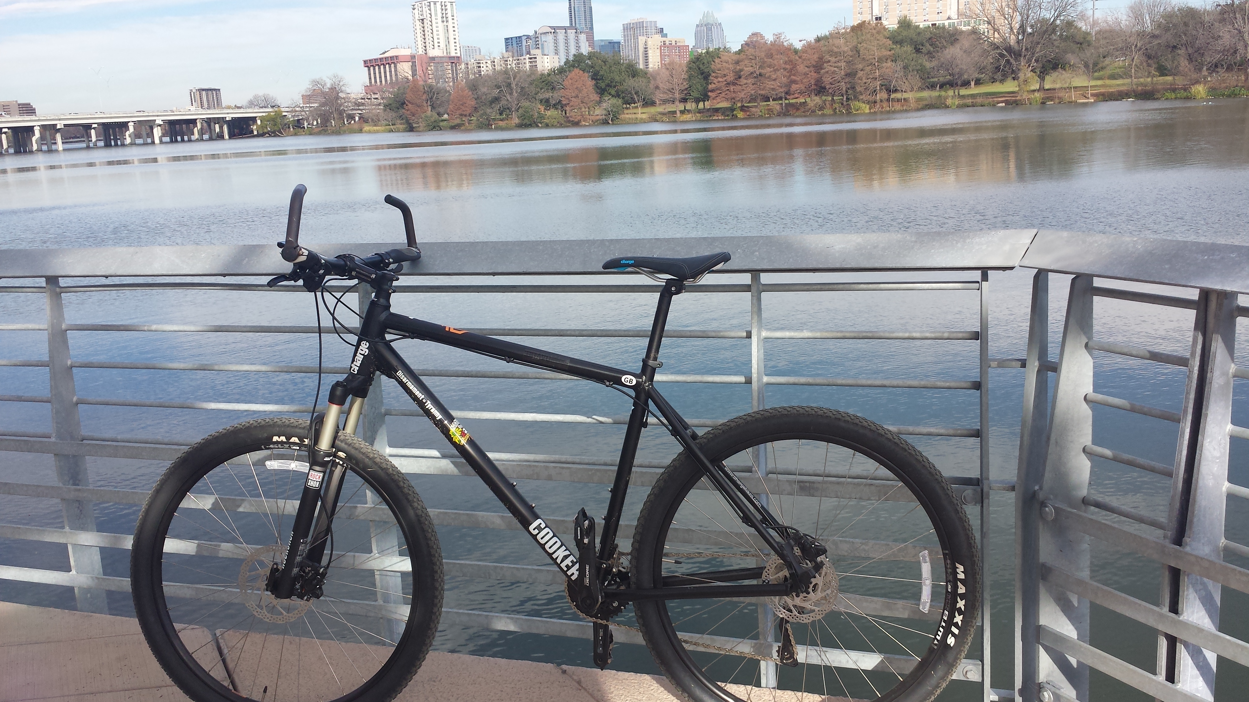 This bike is a beast, it has 29 inch wheels, the standard bike has 26 inchers, that is a bigger difference then I expected. The reason for the new ride was I headed down through Austin, TX on my way to Padre Island for the Christmas break. Hoping to do some beach riding. While in Austin it is exactly 10 miles from the Hotel all the way around the lake (Colorado River) on the hiking trail. Took the pictures on the trail overhanging the water, downtown in the background. Great little ride.